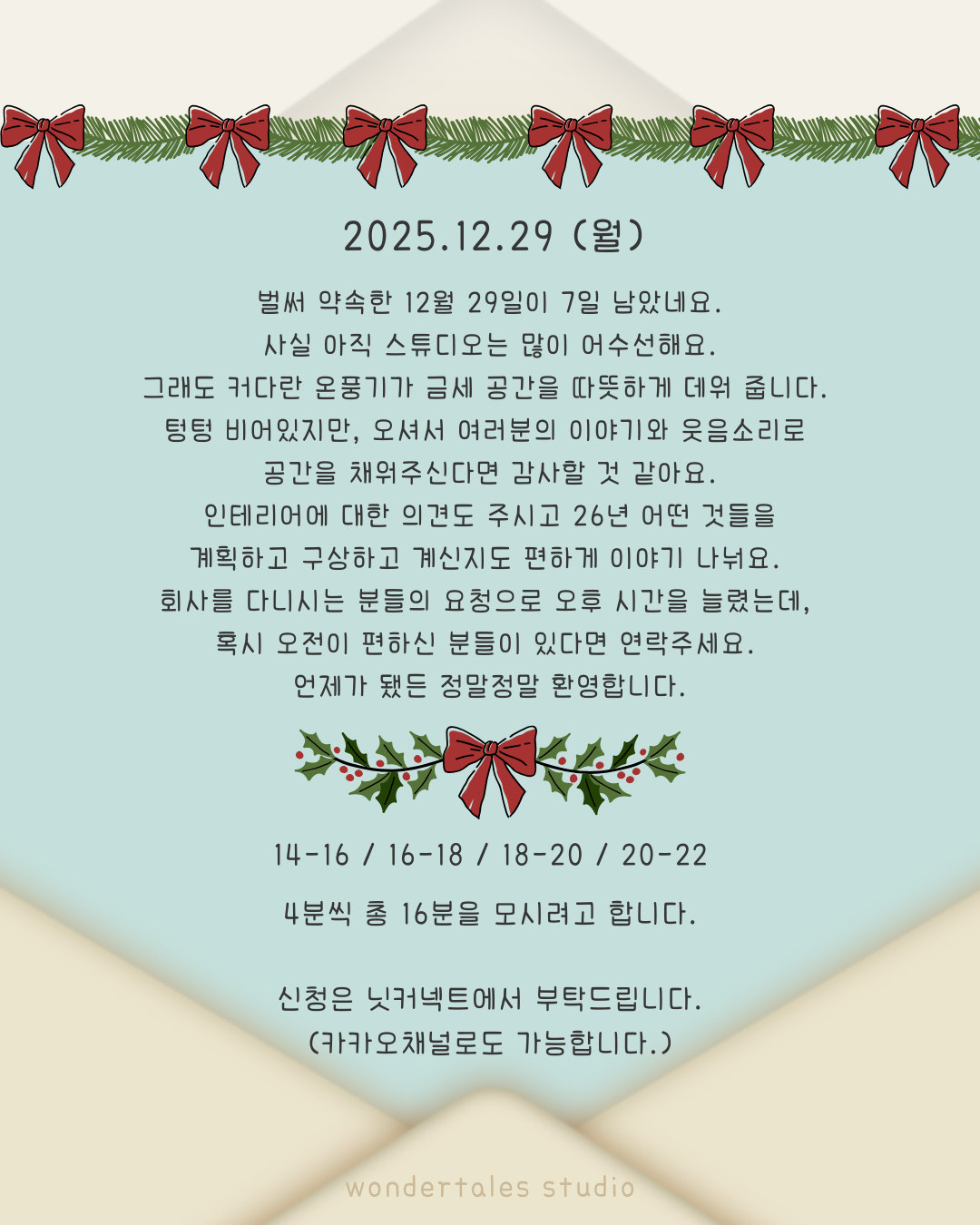 - 모임 일시 : 12월 29일 월요일 ( 14시, 16시, 18시, 20시)