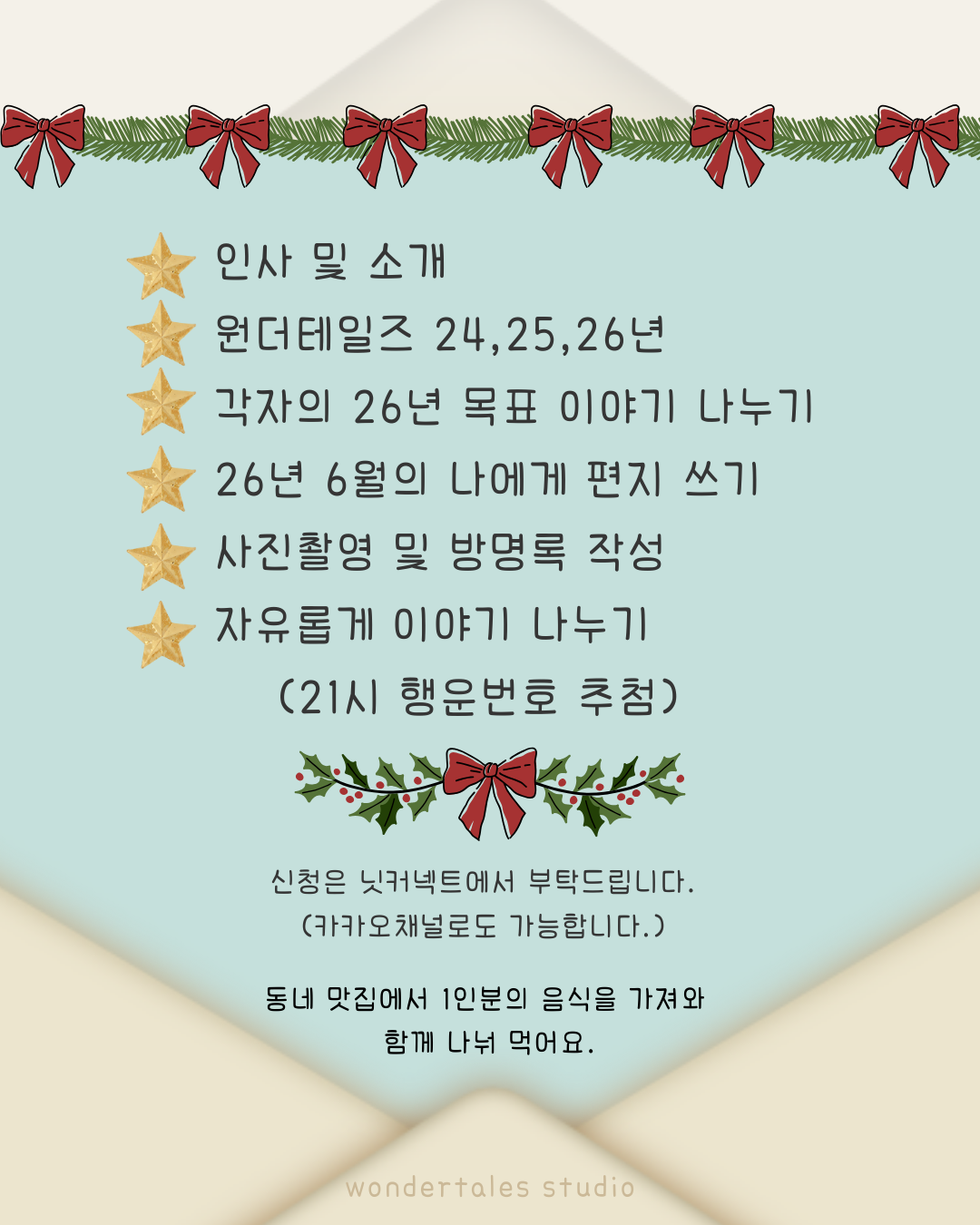 - 모임 장소 : 원더테일즈 스튜디오 ( 송파구 백제고분로 40길 31 4층)