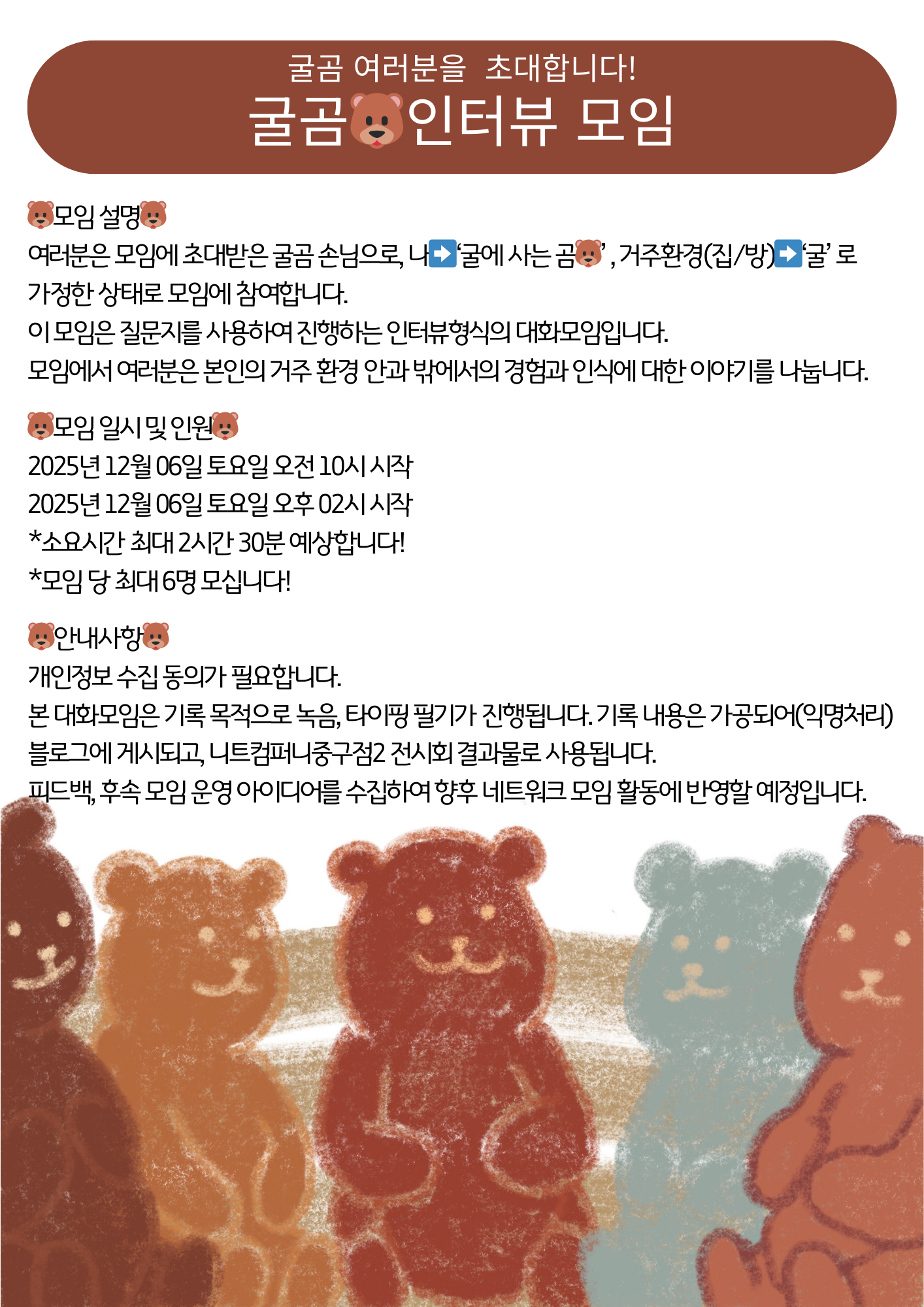 ์ด๋๋ ๊ตด์ ์ฌ๋ ๊ณฐ์ด ๋์๋ค?! ์ฌ๋ฌ๋ถ์ ๋ชจ์์ ์ด๋๋ฐ์ ๊ตด๊ณฐ ์๋์ ๋๋ค. ๋โก๏ธโ๊ตด์ ์ฌ๋ ๊ณฐ๐ปโ , ๊ฑฐ์ฃผํ๊ฒฝ(์ง/๋ฐฉ)โก๏ธโ๊ตดโ ๋ก ๊ฐ์ ํ ์ํ๋ก ๋ชจ์์ ์ฐธ์ฌํฉ๋๋ค. ์ด ๋ชจ์์ ์ง๋ฌธ์ง๋ฅผ ์ฌ์ฉํ์ฌ ์งํํ๋ ์ธํฐ๋ทฐํ์์ ๋ํ๋ชจ์์ ๋๋ค. ๋ชจ์์์ ์ฌ๋ฌ๋ถ์ ๊ฑฐ์ฃผํ๊ฒฝ์ธ ๊ตด ์๊ณผ ๋ฐ์ ๋ํ ๊ฒฝํ๊ณผ ์ธ์์ ๋ํด ์ด์ผ๊ธฐํด์!