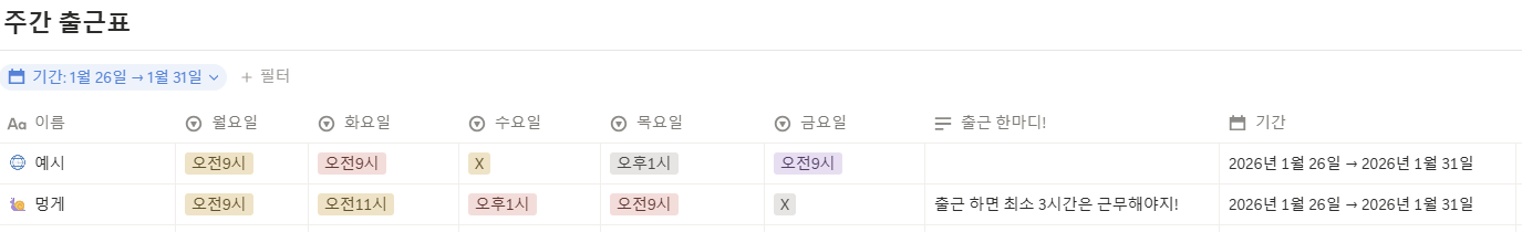 모임 노션에 한 주의 출근 계획표를 작성합니다