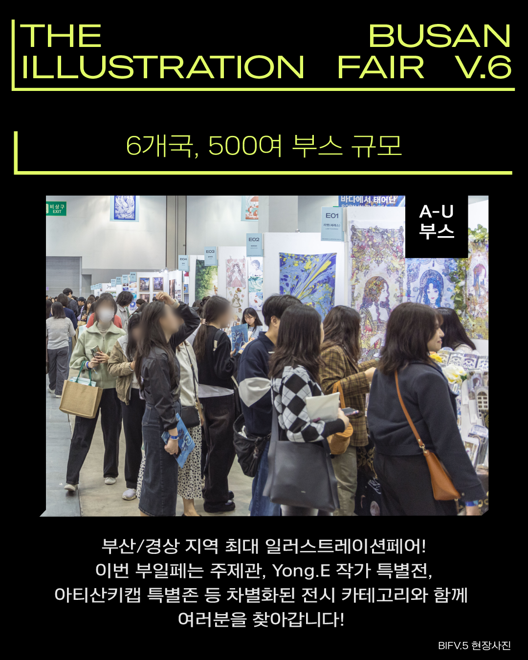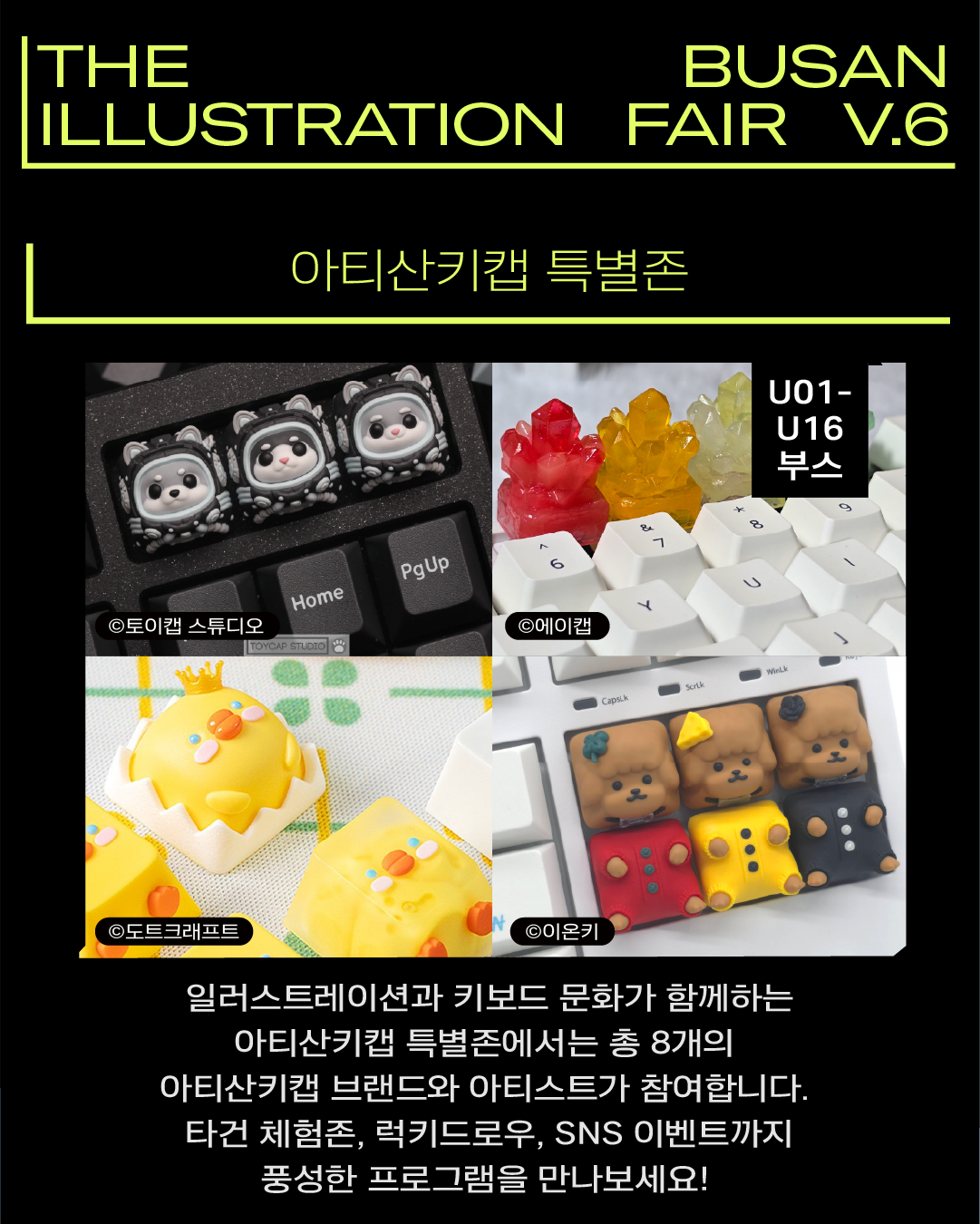 🍎 일러스트레이션, 회화, 그림책, 독립출판, 캐릭터디자인, 그래픽디자인, 아트토이, 게임, 애니메이션, 웹툰, 캘리그라피, 아트토이 등 다양한 분야에서 활동하는 국내외 아티스트를 만나볼 수 있어요! 이번 부일페에서는 6개국, 500여부스가 참여합니다. 주제관, Yong.E 작가 특별전, 아티산키캡 특별존 등 차별화된 전시 카테고리도